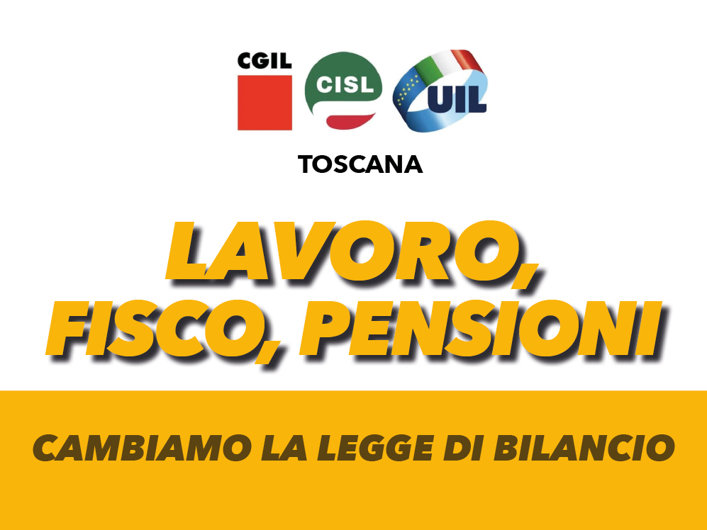 Lavoro, fisco, pensioni, sviluppo, sociale: “Cambiare la Legge di Stabilità”, sabato 27 novembre a Firenze in piazza Santissima Annunziata ore 8:30-13 manifestazione Cgil-Cisl-Uil Toscana (LA LOCANDINA). “Scendiamo in piazza per sostenere le nostre proposte e le piattaforme presentate al Governo in questi mesi e ribadire le priorità: lavoro, occupazione, lotta alla precarietà, protezioni sociali, non autosufficienza, fisco, pensioni, investimenti e per modificare alcune delle annunciate misure della Legge di Bilancio”.