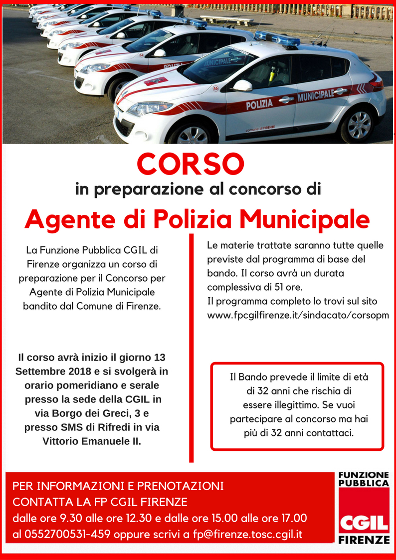 La Funzione Pubblica CGIL di Firenze organizza un corso di preparazione per il Concorso per Agente di Polizia Municipale (cat. C) bandito dal Comune di Firenze, qui bando e domanda on-line sul sito del Comune di Firenze.