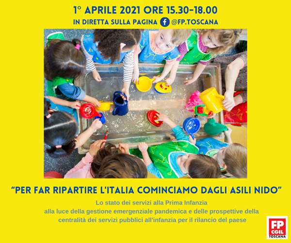 Giovedì 1 aprile dalle 15:30 alle 18:00 in diretta sulla pagina facebook @FP.TOSCANA si terrà l’iniziativa pubblica sullo stato dei servizi alla Prima Infanzia alla luce della gestione emergenziale pandemica e delle prospettive della centralità dei servizi pubblici all’infanzia per il rilancio del paese