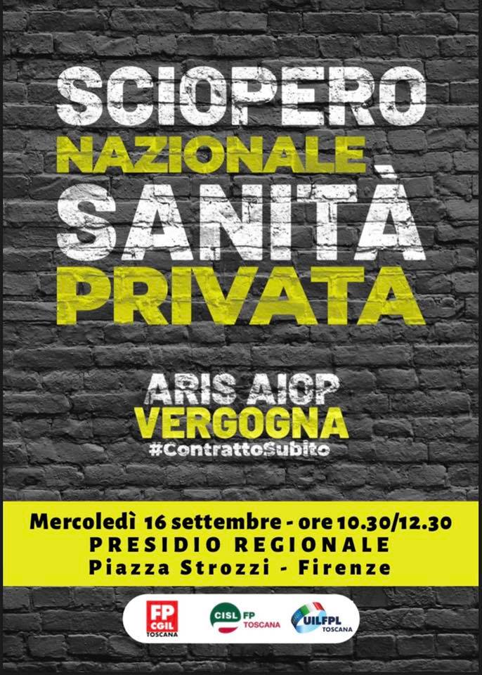 Una mobilitazione che dalla mancata ratifica da parte di Aris e Aiop del Contratto Collettivo Nazionale di lavoro Sanità Privata sottoscritto il 10 giugno, continua dopo il flash mob sul Ponte Vecchio (5 agosto), i presidi svolti davanti a varie Case di Cura della città metropolitana alla presenza dei rispettivi Sindaci come Villa Donatello a Sesto Fiorentino (5 agosto), Valdisieve Hospital a Pelago (6 agosto) e Frate Sole a Figline Incisa Valdarno (10 agosto), il Presidio davanti alla Prefettura di Firenze del 24 agosto e il presidio permanente davanti all’Irccs Don Gnocchi di Firenze svolto dal 24 al 31 agosto.