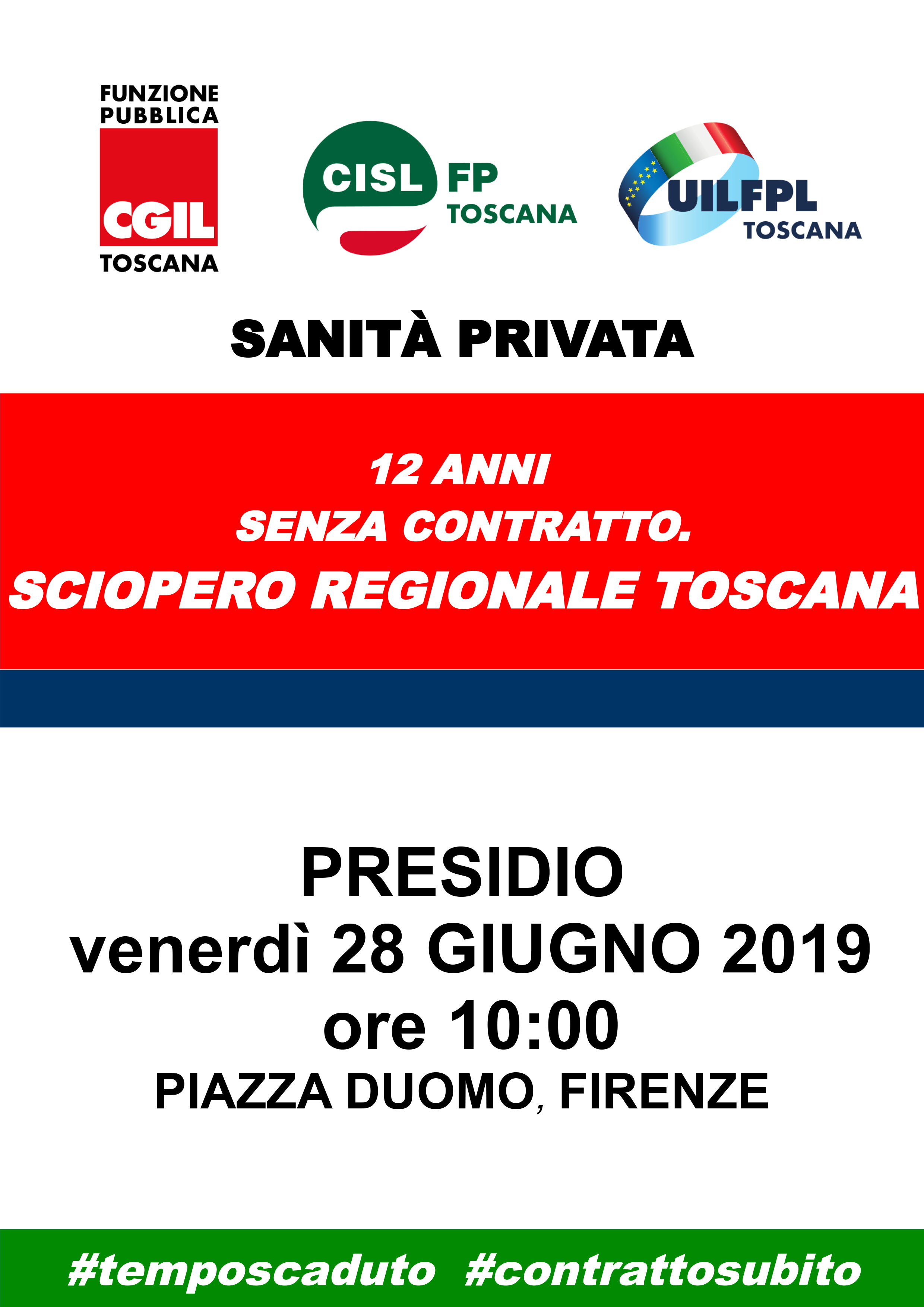 Venerdì 28 giugno sciopero per l’intero turno di lavoro nelle strutture della sanità privata toscana. “Il perdurare del blocco del Contratto Nazionale di riferimento, da oltre 12 anni – dicono Fp Cgil, Cisl Fp e Uil Fpl Toscana – mette a serio rischio l’efficienza di servizi sanitari essenziali per i cittadini toscani, molti dei quali, peraltro, effettuati in regime di convenzione con il Sistema Sanitario regionale, creando una dinamica di dumping contrattuale che mette a rischio la tenuta dell’intero sistema”. Uno sciopero per dire forte e chiaro che il rinnovo del contratto non può più aspettare. Sono oltre 3mila gli addetti della sanità privata in Toscana interessati allo sciopero. Alle 10 in piazza Duomo a Firenze (davanti alla sede della Regione) la manifestzione regionale.